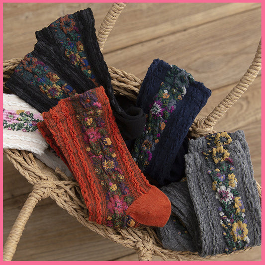 Twist Pattern Medium Tube Women's Literary Cotton Socks Ethnic Style Flower Dark Pattern Socks
