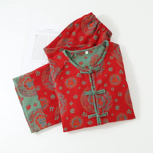National Style Cotton Double-layer Gauze Women's Pajamas Set for New Year Red Plate Buckle Festival Style Home Clothes
