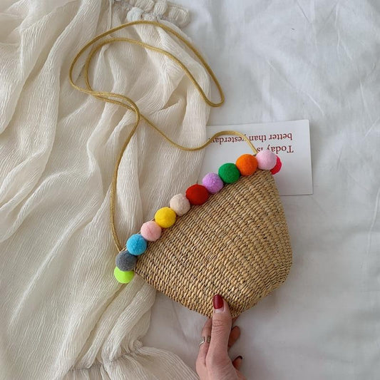 Bohemia Pompom Round Straw Women Summer Rattan Handmade Woven Beach Cross Body Bag