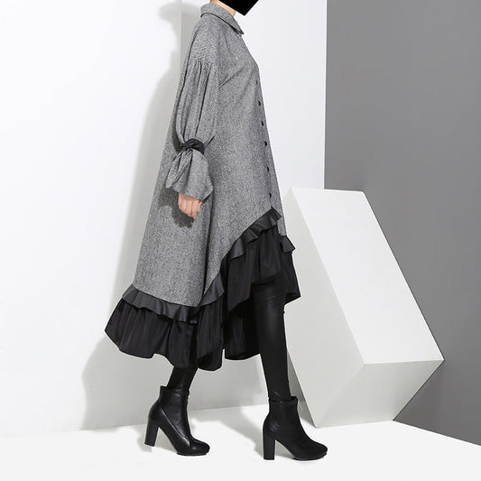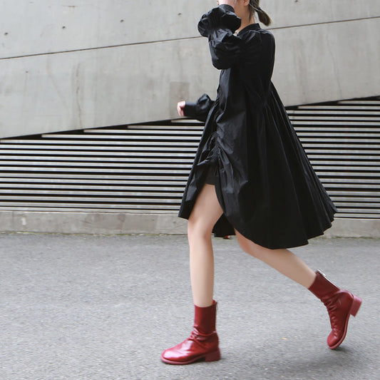 Loose personality fashion pleated stand collar Lantern Sleeve solid color irregular dress