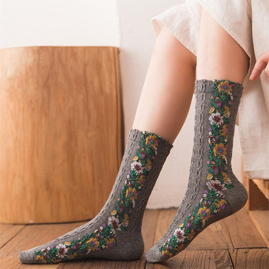 Retro socks women's tube socks ethnic style literary forest floral Japanese pile stockings stockings