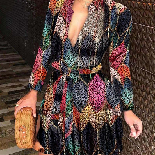 Long Sleeve V-neck Tie Fashion Sexy Printed Dress