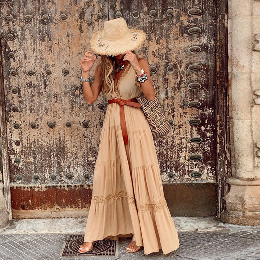 Strap type long temperament mid-length French solid color high waist v-neck stitching long dress