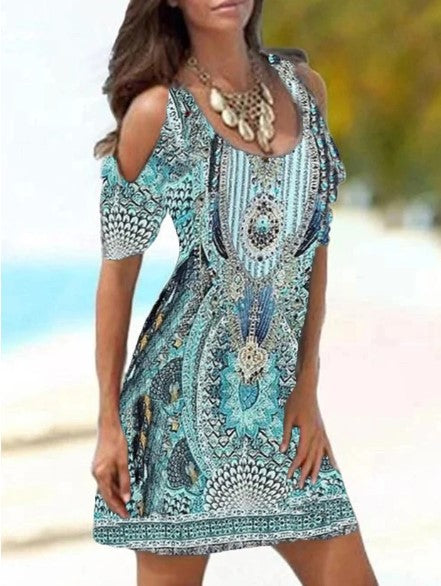 Beach Dress Floral Short Sleeves Round Collar Hollow Short Sleeve Fashion Print Dress 3 Colors