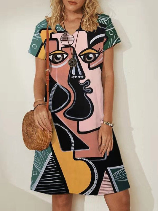 The Pop-up Face Print V-neck Short-sleeve Floral Colorful Women's BOHO Dress