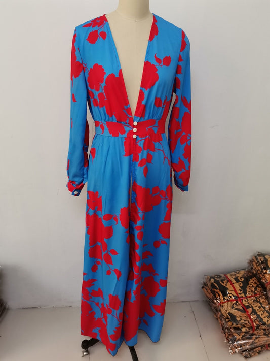 V-neck Print Short-sleeved Dress Green and Red Two Colors Burst Loose Waist Long Skirt Women Summer