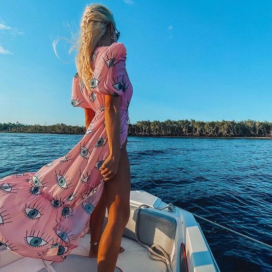 Wrinkle-free Pink Eyes Chiffon Dresses Sexy Short Sleeve 2021 Summer Beach Dress Women Beach Wear Swim Suit Cover Up D1
