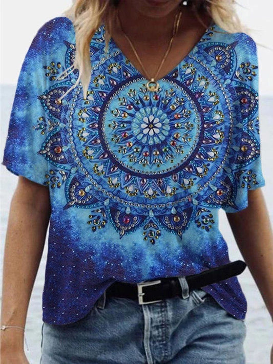 V-neck Abstract Painting Printed Short-sleeved T-shirt Female