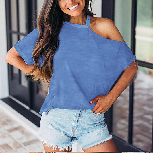Hot Selling Solid Color Short Sleeve Spring and Summer New T-shirt Off Shoulder Top Women's 6 Colors Choice