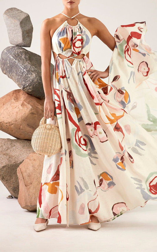 European and American Women's Strap Print Dress New High-waisted Long Dress