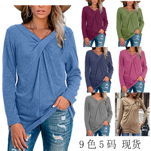 Solid Color V-neck Twisted Long-sleeved T-shirt Spot