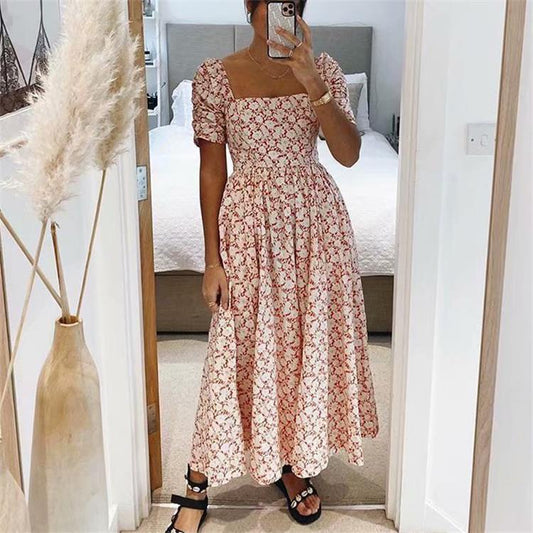 French Square-collar Printed Long Skirt with High Waist Buckle Casual Grand Skirt