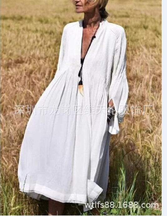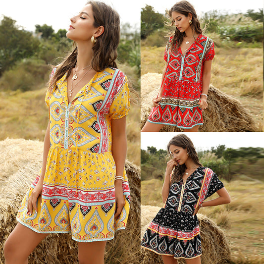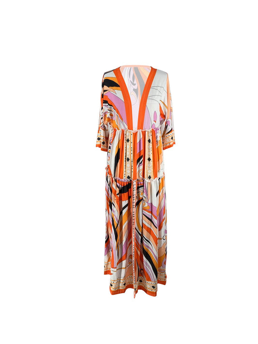 V collar sexy retro abstract print dress 100 casual long skirt women