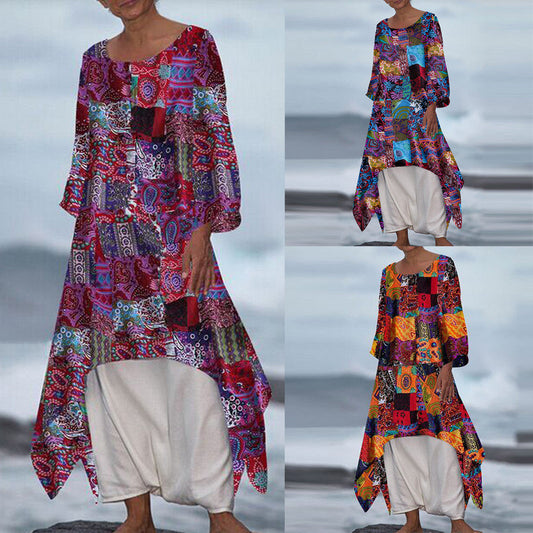 New Bohemian Style Feature Skirt Cotton and Linen Printed Long-Sleeved Dress