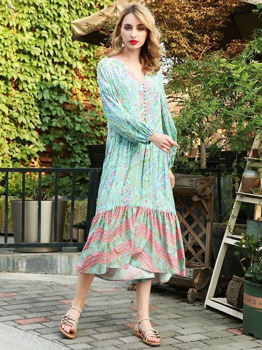 Bohemia Floral V Neck Long Sleeve Maxi Dress