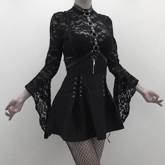 Woman Black Goth Sexy Lace Bodysuit Rompers A Line Skirt Suspender Lace Up See Through Club Wear