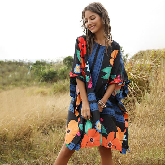 Bohemian Loose Flower Print Short-sleeved Ruffled Summer Mini Dress