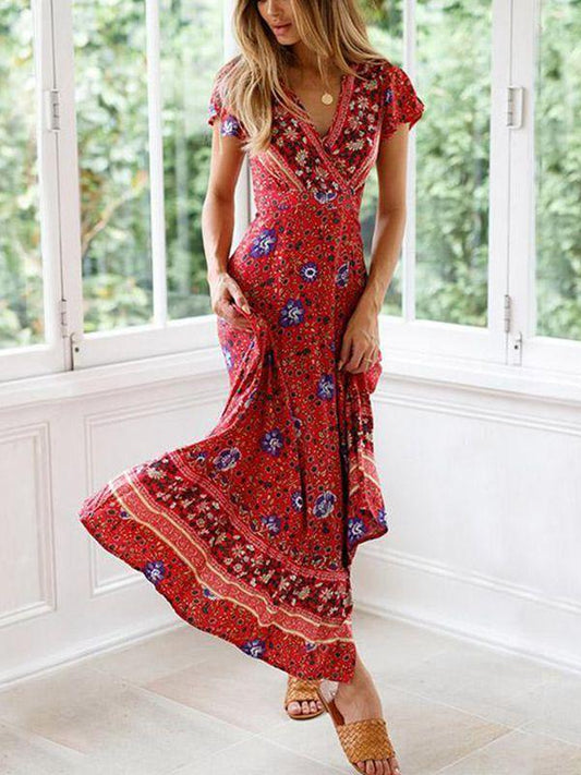 Bohemia V-neck Printed Beach Maxi Split Dresses