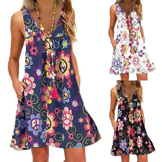 Casual Vacation Bohemian Beach V-Neck Sleeveless Beach Printed Mini Dress