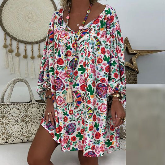 Women's Dresses Plus Size Loose Print Long Sleeve V-Collar Button Mini Dress