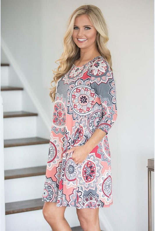 Round Collar Middle Sleeve Tie-dyed Loose Dress