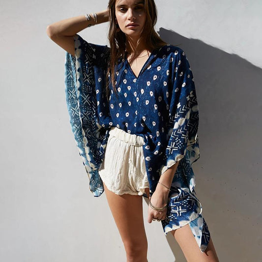 Bat Sleeve Long Sleeve Stitching Loose V-neck Summer Jacket Printed Women's Sunscreen Blouse