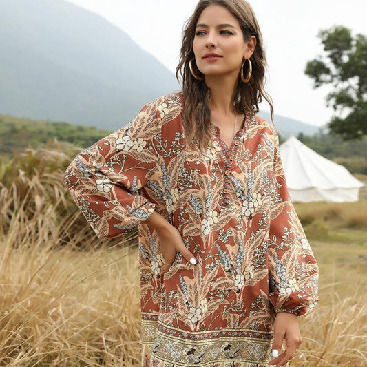 Summer and spring Bohemian V-neck casual dress Printed Dress Medium Length Skirt