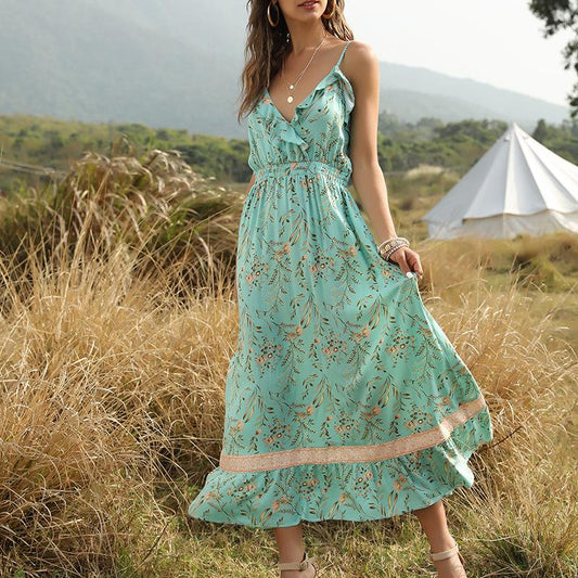 Bohemian Wind Printed Flounced V-neck Suspender Dress