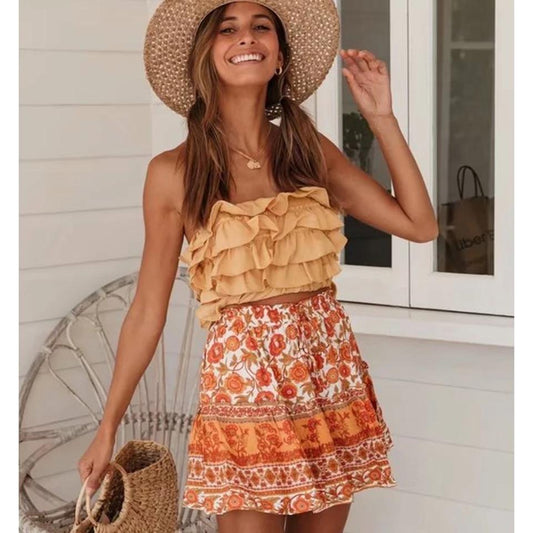 Mini Rok Geel Katoen Bloemenprint Elastische Taille Chic Beach Boho Casual Short Skirt