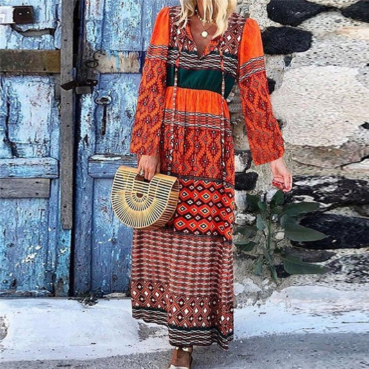 Bohemian deep V collar tie with back-to-back retro-printed large irregular dress