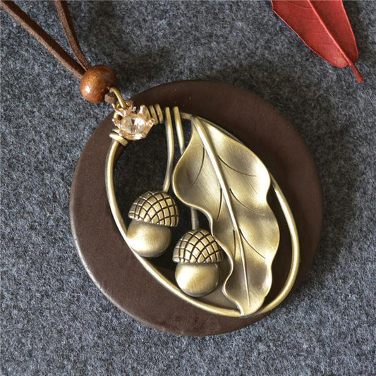 Retro National Wind Alloy Oak Large Leaves Wooden Bright Drill Long Necklace