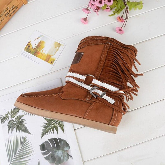 Fringe Midden Laarzen Vrouwen Sexy Kwastje Laarzen Mode Gesp Motorlaarzen Platte Hak Laars Vrouwen Cowboy Stijl Boot