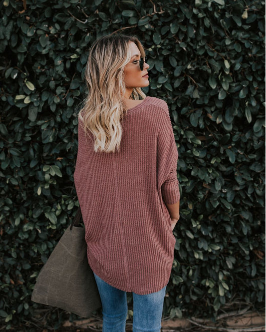 Knit V Neck Long Sleeve Solid Color Top Blouse