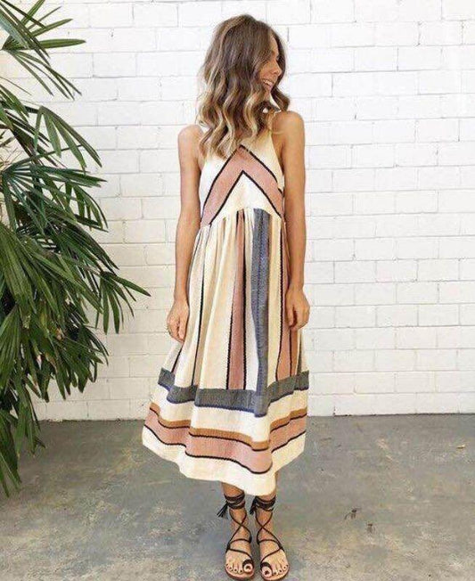 Boho Beach O Neck Sleeveless Print Stripe A Line Maxi Dress
