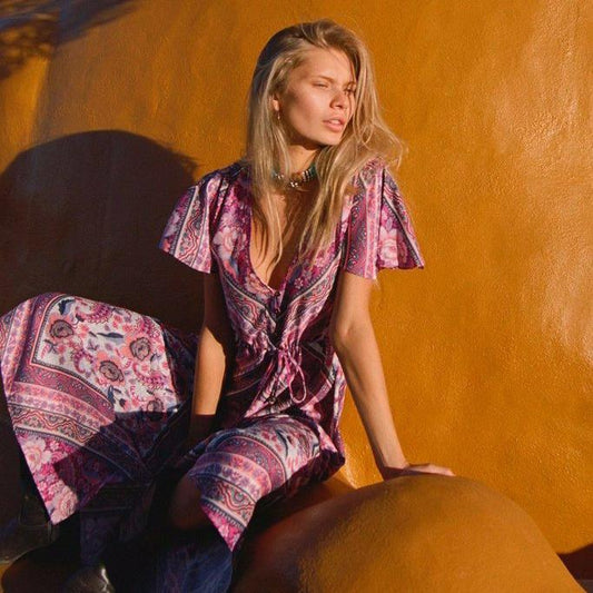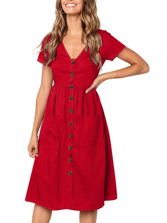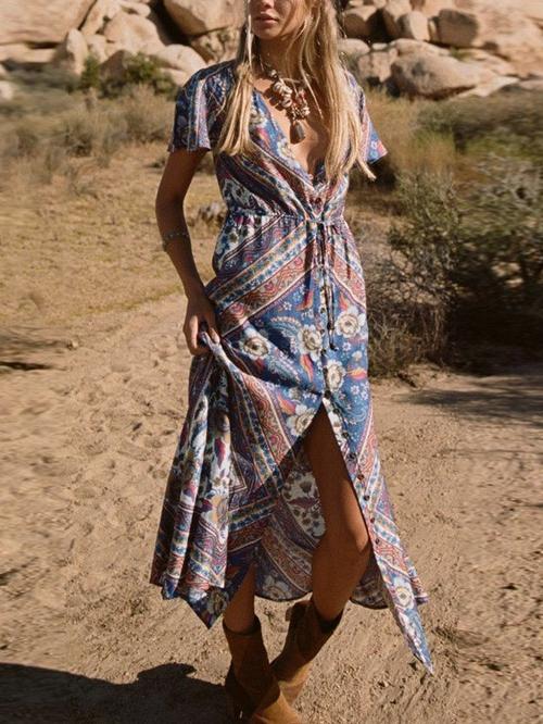 Casual V-neck Short Sleeve Loose Light Split Beach Long Dress