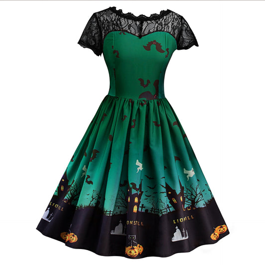 Women Short Sleeve Castle Pumpkin Halloween Lace Dress
