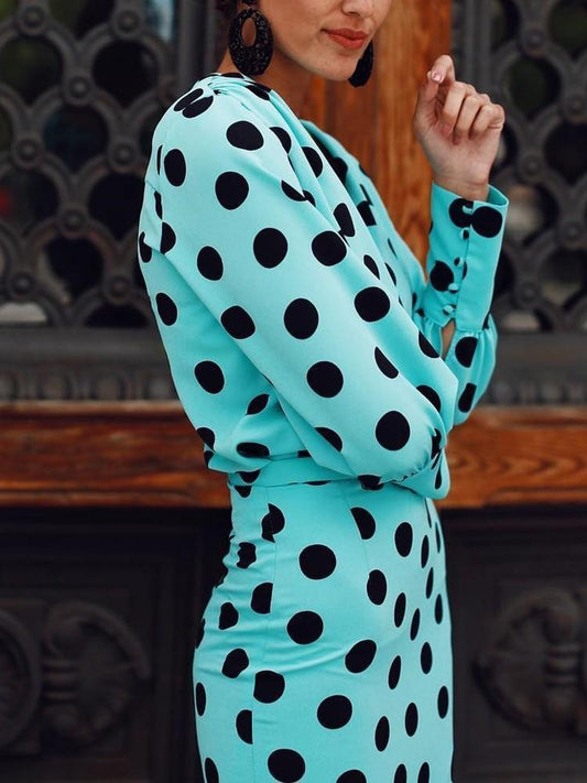 Sexy Deep V-neck Long Sleeve Polka Midi Dress