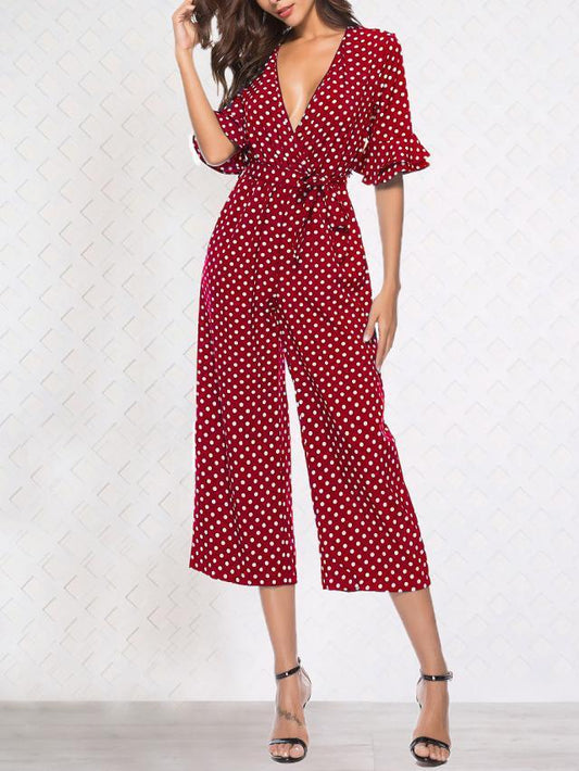 Mid-sleeve V-neck Dot Print Jumpsuit