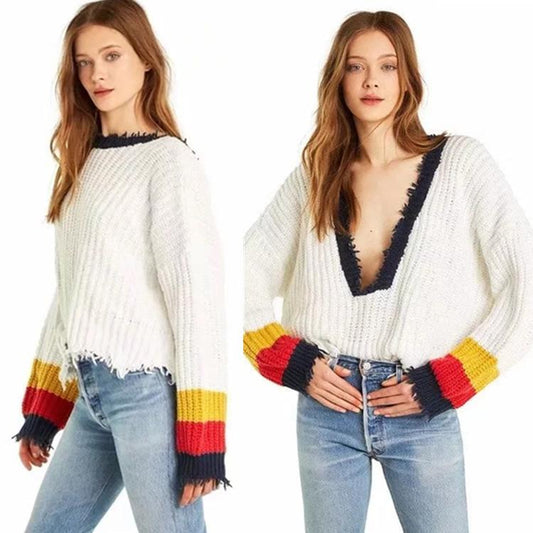 Autumn Long Sleeve Deep V Neck Star Tassels Sweater