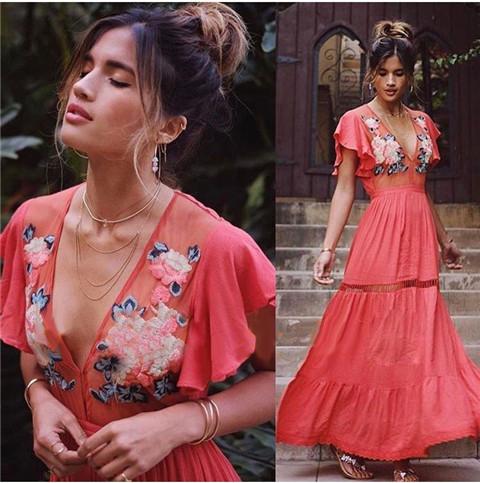 Bohemian High Waist Petal Sleeve Deep V Neck Maxi Dress
