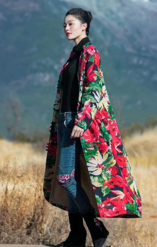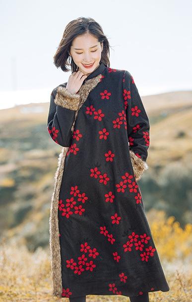 National Style Floral Retro Slim Long Cotton Velvet Robes Coat