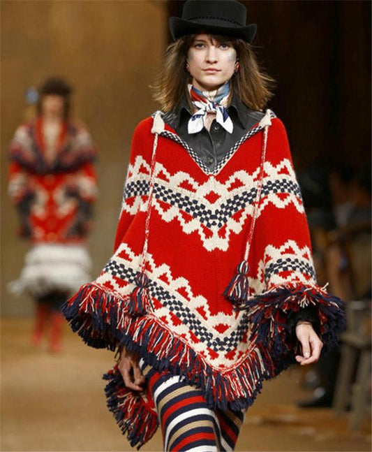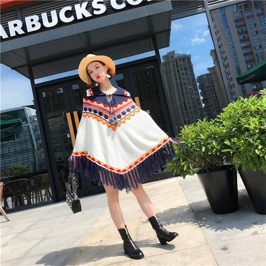Folk Style Tassel Knit Shawl Cloak Sweater