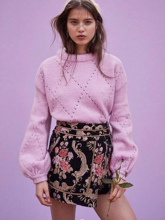 Casual Long Sleeve Solid Color Hollow Out Knit Short Pullover Sweater
