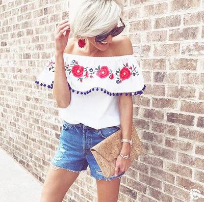 Pompom Off The Shoulder Ruffles Short Sleeve Loose Blouse Tops