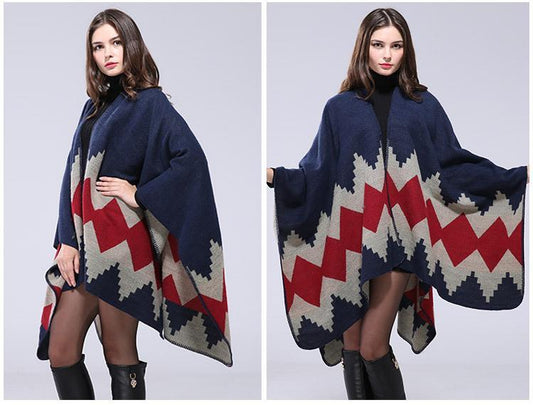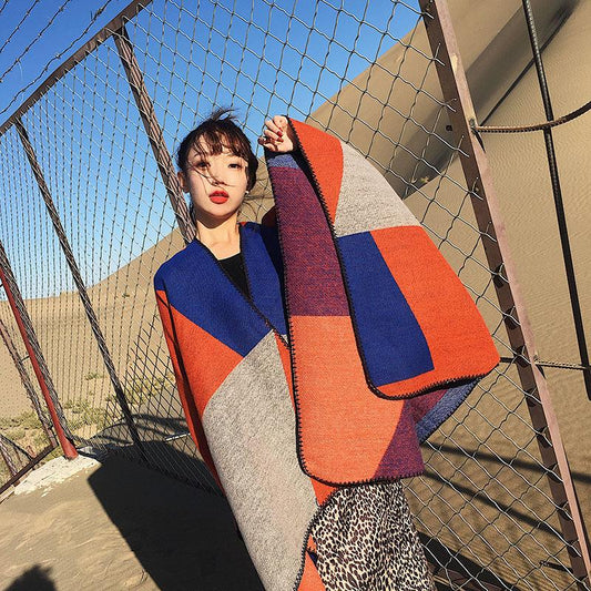Oversized Thickening Winter Color Block Cloak Shawl