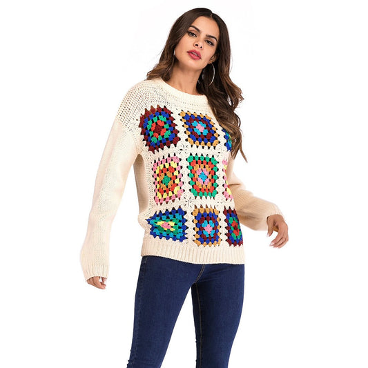 Boho Handmade Square Pattern Knit Stiching Sweater