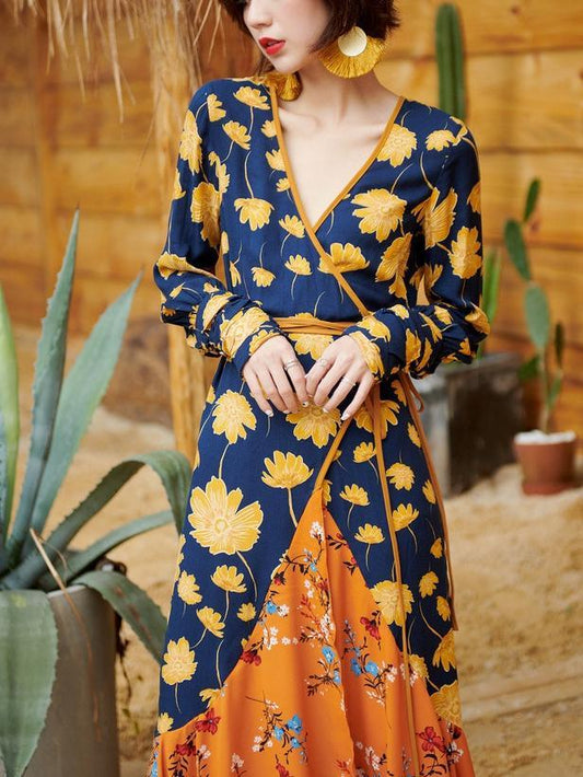 V-Neck Print Slim Fit Bohemian Long Dress