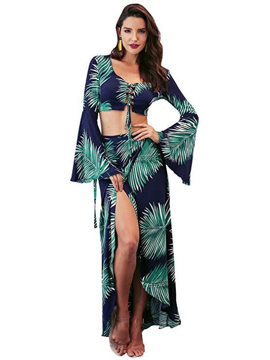 Sexy Two-Piece Lace Up Flare Sleeve Floral Printed Crop Tops Skirts Outfits