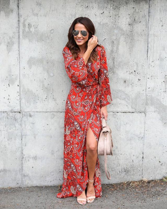 Bohemian Floral Long Sleeve V-neck Chiffon Long Dress