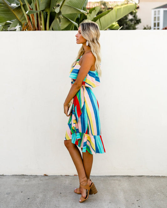Sloping Shoulder Strapless Lace-Up Irregular Rainbow Striped Dress